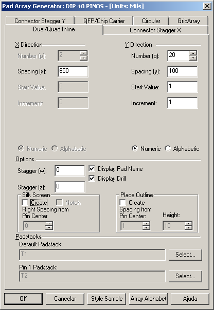 A princípio estas configurações podem ser um pouco confusa, e para ajudar na tela de Pad Array Generator tem-se o botão Style Sample, que para o caso do DIP a ser criado é o seguinte, como mostrado na figura 8.
